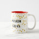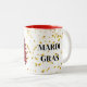 This coffee mug is shown with an image of a festive Mardi Gras mask over golden confetti with Text of "MARDI GRAS'.