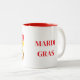 This coffee mug is shown with an image of a festive Mardi Gras mask with Text of "MARDI GRAS'.