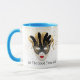 This combo Blue and white mug has an image of a Mardi Gras masks over petite golden-colour stars on a white background. Text of "Let the good times roll' is beneath the mask on Each side of the mug. Customize this item or buy as designed. Colours: bright blue handle and interior, white background, golden stars and a gold and black coloured masks.