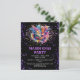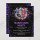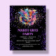 Customizable Mardi Gras party paper invitation. Featuring a colourful Mardi Gras masquerade mask and faux glitter print on a black background.