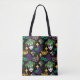Mardi gras carnival tote bag patterned with carnival face masks, fleur de lis motifs and jester masks in purple, green and gold on black