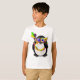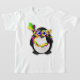 A festive penguin all dressed up for Mardi Gras with a green, purple and gold feathered mask and Mardi Gras beads!
