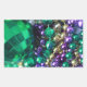 Photo de perles Mardi Gras avec une grande perle verte. Les couleurs des perles sont les couleurs dorées, violettes et vertes de Mardi Gras. Les perles sont aussi connues sous le nom de "lancers" car elles sont jetées par des membres krewe à ceux qui regardent la parade flotter. Cette image peut être customisée pour ajouter votre propre texte.