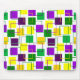 This mouse pad has a geometric design of squares in purple, yellow, and green scattered about with their outlines.