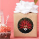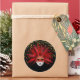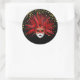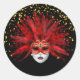 This large size round sticker is shown in a festive Mardi Gras celebration mask print design.