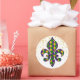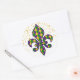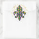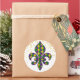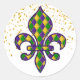 This large size round sticker is shown in a Mardi Gras celebration Fleur De Li print design.