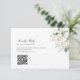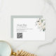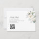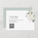 Carte mariage RSVP de code QR avec lettrage noir simple, feuillage eucalyptus et fleurs blanches.