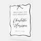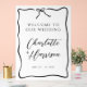 Un simple panneau de bienvenue de mariage à la typographie moderne minimaliste manuscrite noire et blanche comportant un cadre de ruban ondulé avec un petit nœud dans un style dessiné à la main. Style coquette fantaisiste informel. Fantaisie moderne simple. Pour un style de mariage plus informel et ludique.