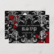 Carte de mariage de style gothique personnalisée RSVP pour votre mariage à thème Halloween ou vampire. Il est noir avec un motif damassé gris clair à gris foncé et des éclaboussures de sang que vous pouvez retirer si désiré. Ajoutez votre propre texte à l'avant et à l'arrière.