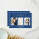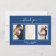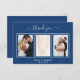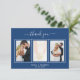Un Carte de remerciements mariage élégant et simple de la mariée et du marié, personnalisé avec votre propre photo. Ajoutez 3 de Vos photos mariages, taille verticale, date du mariage, vos noms et la note de remerciement. Un arrière - plan bleu marine tendance avec un texte blanc et un cadre blanc. Le texte : Merci sur l'avant et vos noms sur l'arrière sont écrits avec une écriture manuscrite stylisée.