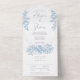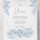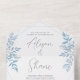 L'élégante invitation tout-en-un boho présente une bordure géométrique moderne et des feuilles d'eucalyptus bleus poussiéreux. Personnalisez avec vos détails mariages avec le modèle facile à éditer avec une police de script romantique et une police sans serif moderne. Consultez les articles correspondants dans la collection "Blue Eucalyptus".