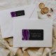 Le bord gauche de cette élégante étiquette d'adresse de retour faire-part de mariage moderne comporte une bordure d'aquarelle violette ornée d'une parties scintillant en faux argent. Le texte personnalisable associe écriture gris argenté et fontes sur cuivre sur un arrière - plan non noir.