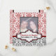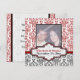 Faire-part de mariage personnalisé damas noir blanc rouge Save the Date. La partie supérieure est ornée d'un motif damas rouge et blanc et la partie inférieure est en noir et blanc. Une bande rouge sépare les deux parties. Votre texte est saisi sur une étiquette élégante avec un contour blanc et rouge.