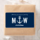 Étiquettes de bouteille d'eau mariage marine bleu et blanc sur mesure ancre marine. Modèle autocollant élégant personnalisé avec design d'ancre bateau / bateau. Typographie de script élégant pour les noms de mariée et mariée et message de remerciement. Utilisez comme décor de table classe ou merci pour les invités à la mariage / fête de mariage. Le logo comprend le nom ou le monogramme plus la date du mariage. Design classique avec couleur arrière - plan personnalisable. Parfait pour les mariages de destination. Aussi grand comme étiquette de vin. Merci d'avoir rejoint notre journée spéciale. Le thème de la plage maritime. Style vintage. Les ancres d'apparence détendues pèsent sur l'icône.