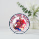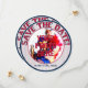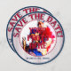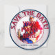 Mariage de baseball Thématique-Round Enregistrer les cartes de date-Modèle 3. Le côté avant de la carte est un insert/cadre photo. Boucles intérieures bleues et rouges avec une photo personnalisée au centre. Retirez mon insert photo et remplacez-le par une photo de votre propre. Le texte décoratif en verre rouge et bleu tourne autour du haut et dit : ENREGISTREZ LA DATE. D'autres textes sont en bas et on peut lire : LE MARIAGE DES COUPLES DATE. Modifier le texte pour les dates, les noms des couples, etc. Supprimez/effacez le texte s'il n'est pas désiré. L'arrière - plan extérieur de la jante est rouge, blanc et bleu rayures de baseball. Sur le côté arrière de la carte, vous avez le même texte en haut. Le texte du bas dit : Un MARIAGE MAISON. Deux chauves-souris en bois, rouge et bleu, s'assoient sur la gauche. L'arrière - plan central est un baseball blanc avec couture rouge. Le texte décoratif tourne autour du ballon et dit : LUI et ELLE (vos noms) sont en train de monter à la plaque et de batter 1000 que leur amour sera dernier pour toujours. Les équipes fusionneront en une seule sur...votre rendez-vous. Rejoignez-nous pour célébrer notre amour mutuel. Les invitations à thème du mariage de baseball sont disponibles en plusieurs motifs de mixage et de match. Ces invitations incluent également les enveloppes.