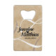 Ajoutez une touche de charme vintage à votre journée spéciale avec ce ouvre-bouteille rustique, qui comprend du serif blanc et des lettres de script sur un arrière - plan (simulé) taché et défraîchi / toile / lin brut / texture papier kraft. Customisez avec les noms des jeunes mariés, une initiale ou un monogramme pour le nom de famille et la date du mariage. Reverse affiche un design identique. Faites une grande faveur de mariage pour les invités! Design © W.H. Sim. Voir plus sur zazzle.com/expressionsoccasions