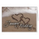 Deux coeurs dans le sable avec des ressacs et le mariage de janvier dans la police blanche de manuscrit. Perfectionnez la conception pour annoncer votre mariage prochain de janvier. Aimez sur la plage !