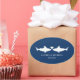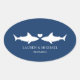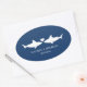 Les autocollants de mariage de requin dans un arrière - plan bleu marine classique avec silhouette de requin blanc avec un coeur, les noms de couple et la date.
