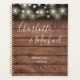 Élégant planificateur de mariage personnalisé avec des noms de style signature sur un arrière - plan rustique en bois et lampes à cordes. Conçu par Thisisnotme©
