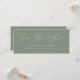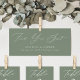 Elégant en-tête de tableau de sièges de mariage avec la phrase "Trouvez votre siège" affichée dans un script de calligraphie blanc moderne avec un arrière - plan vert sage. Personnalisez la carte d'en-tête du plan de sièges vert sage avec vos noms, votre date de mariage et l'emplacement du mariage. Le design s'harmonise avec notre collection de mariages Modern Elegance.