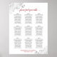 Ce beau tableau de sièges mariage de 9 tables comprend des assignations de tables pour 90 personnes, avec 10 personnes à chaque table. Le design est simple mais élégant avec du gris foncé et du texte rouge sur un arrière - plan blanc et comporte des fraises en faux feuille argent en dentelle dans les coins et un titre de calligraphie de script sophistiqué "s'il vous plaît trouver votre table." Sophistiqué et chic.