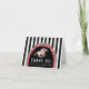 Cette carte de remerciement sur le thème de Derby comporte un cheval de course à l'aquarelle avec un jockey en rose entouré d'une couronne de roses rouges avec la phrase "Merci" Il y a un fond rayé noir et blanc.