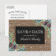 Cartes de sauvegarde de date de mariage hivernales rustiques avec un fond en bois rustique, un centre de tableau noir, une corde, des pommes de pin de Noël, des baies, du feuillage, des éclaboussures blanches de neige et un modèle de mariage personnalisé.
