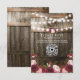 Cartes de réponse de mariage champêtre avec un fond de tonneau en bois rustique, guirlande lumineuse, fleurs aquarelles bordeaux et rose, votre monogramme et un code QR pour que vos invités scannent.