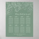 Cet élégant tableau de sièges de table de mariage présente un délicat design ornemental floral avec des fleurs, des oiseaux et des feuilles sur un arrière - plan vert sage. Le texte combine écriture manuscrite et polices serif pour un look élégant et moderne. Parfait pour un mariage de automne d'hiver ou d'automne.
