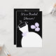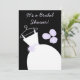 Jolie invitation à la douche nuptiale avec une robe mariage stylisée et des fleurs dans les tons violet et blanc sur un arrière - plan noir, et texte blanc et violet. Un design personnalisable pour personnaliser avec votre propre texte, photos et idées.