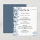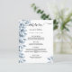 Une carte de menu mariage élégante et tendance. Floraux botaniques de couleur bleu, feuilles et sprigs. Personnalisez et ajoutez vos noms, votre date et le menu mariage. Un arrière - plan blanc chic. Lettres de couleur noire. Le mot Menu est écrit avec un script de style de lettres à la main moderne avec des swashes. Retour : arrière - plan gris bleu.