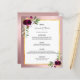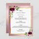 Une élégante carte de menu mariage de style bohème. Plumes et roses luxuriants en bordeaux. Modèles pour vos noms, date et le menu mariage. Un cadre en faux or et blanc et une couleur rose chic et poussiéreuse arrière - plan. Lettres de couleur grise. Dos : faux rose poussiéreux à l'aspect métallique arrière - plan.