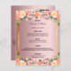 Une élégante carte de menu mariage de style bohème. Roses roses et verdoyants dans le décor. Modèles pour vos noms, date et le menu mariage. Un cadre en faux or et une couleur arrière - plan rose imitation métallique chic et poussiéreuse. Lettres de couleur noire. Dos : faux rose poussiéreux à l'apparence métallique arrière - plan, votre photo et ajouter votre histoire d'amour. Donnez aux gens quelque chose dont il faut parler en attendant que la nourriture soit servie !