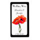 Elégant mini étiquettes de vin pour votre mariage, fait en noir, avec une zone de texte blanc, et des graphiques de deux beaux pavots orange, au milieu. Le texte en noir est prêt à être personnalisé avec vos informations de mariage. Accompagnement de réception parfait, avec nos produits de mariage pavot orange.