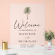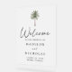 Panneau de bienvenue mariage tropical avec un simple palmier en haut du design avec "Welcome" affiché dans un script de calligraphie blanc moderne avec un arrière - plan acrylique faux givré. Personnalisez le signe mariage de palmier avec vos noms, la date du mariage et l'emplacement du mariage. Le panneau de mariage tropical acrylique a été conçu pour coordonner avec notre collection de mariages minimaux de palmiers.