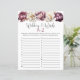 Un jeu amusant pour une douche nuptiale, "Mariage Words A-Z" est une feuille de jeu pour vos invités à écrire autant de mots mariages liés qu'ils peuvent penser à cela commencer par chaque lettre de l'alphabet. La personne qui a le plus de mots gagne ! Cette carte de jeu a de belles fleurs rustiques en bordeaux, prune, rose poussiéreux et ivoire. Il fait partie d'une collection de douches nuptiales assorties pour accueillir une belle douche nuptiale.