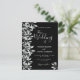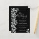 Un faire-part de mariage tendance en noir et blanc. Un arrière - plan noir chic sur le devant. Décoré de blanc botanique, de motifs argentés et de feuillage. Un grand script à main moderne, typographie avec le texte : Le mariage de. Modèle pour les noms et les détails mariages. Texte blanc. Retour : arrière - plan noir.