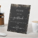 Un élégant arrière - plan noir décoré de parties scintillant en faux or brille. Avec le texte : S'il vous plaît signer le livre d'or pour la nouvelle Mr et Mrs. Avec un coeur. Lettres blanches.