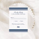 Définissez un ton soigné avec cette carte de réponse RSVP avec des accents de rayure marine classiques et une mise en page nautique épurée. « Répondez aimablement » en écriture élégante se marie avec des lignes nettes pour les noms, les acceptations/regrets et le nombre d'invités. Parfait pour les invitations de mariage côtiers, de voile et de club de yacht.