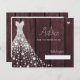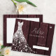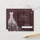 Diamants blancs brillants robe de mariage sur un arrière - plan en bois de grange bordeaux foncé faisant une simple carte de conseil de douche nuptiale moderne et élégant.