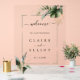 Ce panneau d'accueil mariage présente une aquarelle vert feuillage tropical, des feuilles de palmiers, des feuilles de bananes avec un cadre rectangle vert. Il est parfait pour un mariage tropical, plage, été ou destination.
