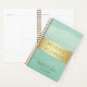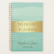 Wedding planner vert menthe simple et élégante avec des détails en feuille d'or jaune et des noms de couple, pour mariées modernes.