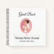 Un livre d'hôtes de douche nuptiale. Conçu avec l'illustration d'une mariée heureuse tenant un bouquet de fleurs dans sa robe mariage blanche de fantaisie et portant un voile simple. Placez-vous à l'intérieur d'un cadre en camée rose avec une bordure en échalotes.