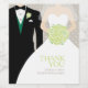Elégante mariée en robe blanche avec une poitrine de roses stylisés verts et marié en cravate arc et gilet vert vous remercie étiquettes de vin. Modifiez ces étiquettes avec votre propre nom de mariée et de mariée. Idéal pour utiliser sur le vin ou la bière de donner des remerciements et des faveurs de mariage. Design unique et art graphique de Sarah Trett. © Art et design par Sarah Trett. www.sarahtrett.com pour www.mylittleeden.com