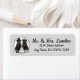 Rottweilers mariés - Joli dessin animé d'une mariée et d'un marié Rottweiler souriants, le jour de leur mariage, avec un bouquet de fleurs, une alliance, et un gâteau de mariage à étages avec un décor de cloches de mariage argentées. La mariée heureuse porte un voile de mariée blanc et un collé de perles. Le marié porte un col de smoking, un nœud papillon et un haut-de-forme. Copyright © Angi Laframboise. Cadeaux de dessins animés drôles de races de chiens pour les amoureux des chiens, les jeunes mariés et les couples mariés.