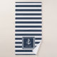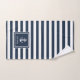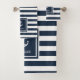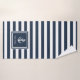 Un élégant ensemble de serviettes nautiques personnalisées avec ancre et motif rayé bleu marine et blanc avec votre nom de bateau dans un carré bleu marine. Conçu par Thisisnotme©