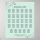 Ce magnifique tableau de sièges mariage présente un design simple mais élégant avec du texte bleu marine sur un arrière - plan vert clair ou de couleur néo-menthe. Il y a des fraises fantaisie argentées grises ou floral dans les coins et un titre de calligraphie de script "s'il vous plaît trouver votre table." Le tableau a des affectations de table pour 290 invités à 29 tables (10 places par table).