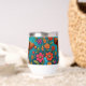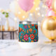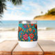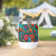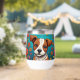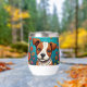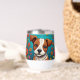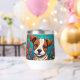 Adorable art de l'air blanc avec un chien chiot brun et blanc entouré de fleurs d'art populaire en rose, orange et violet.