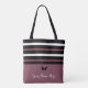 Elegant wide maroon, black and white stripes cover the top of this Tote Bag, while the bottom is maroon, with a small butterfly silhouette and space for your name. Lovely, and perfect for work, school or shopping.