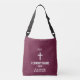 Blue abstract flowers on maroon background geometric pattern crossbody Christian backpack, featuring a cross. You can customize the text, including your own initials (or name if you prefer), your favourite book of the Bible, the chapter and verse, and you can include a short quote from the verse - or simply delete the quotation if you like to keep the design as just a simple book-chapter-verse style.